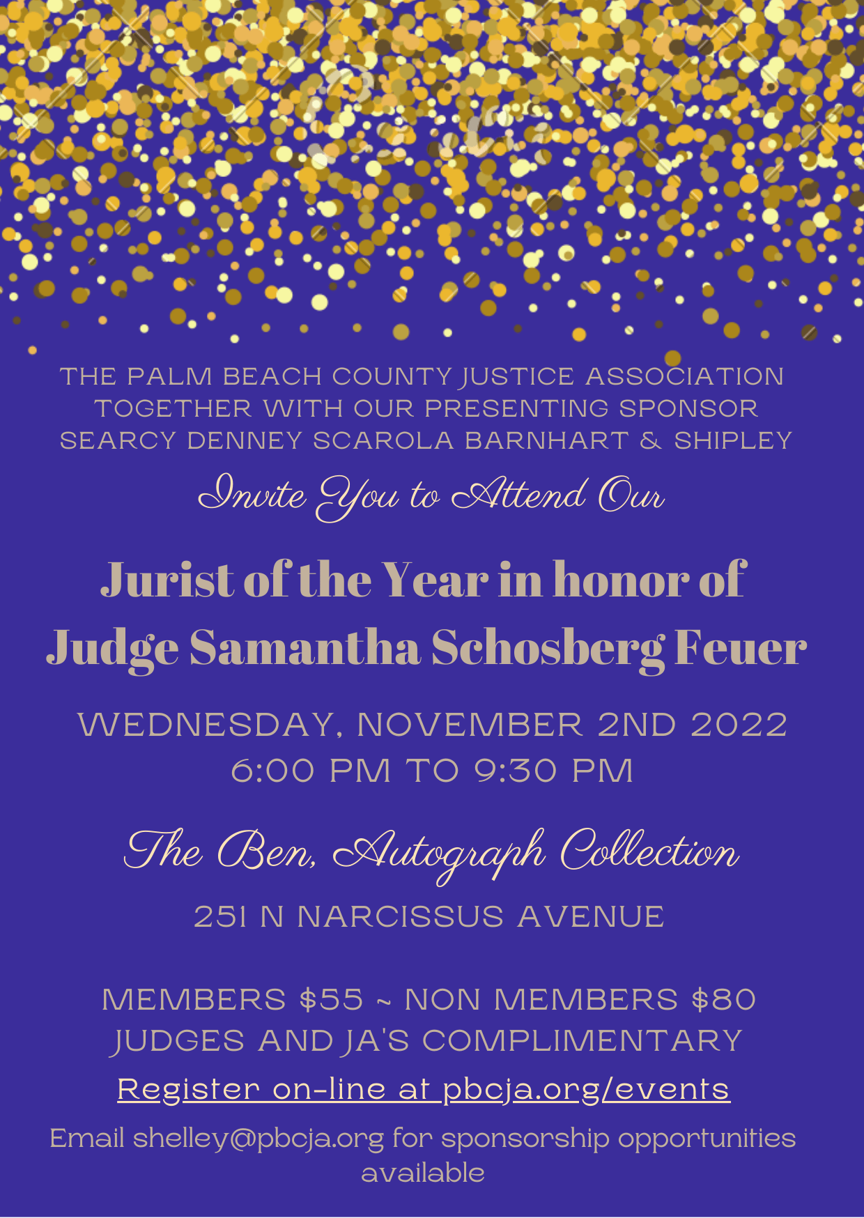 **SOLD OUT** 2022 Jurist of the Year Dinner honoring Judge Samantha Schosberg Feuer November 2, 2022 6:00 PM